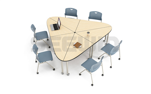 SEEWIN詩敏教學設備七巧系列人工智能教室組合桌協(xié)作式三角形拼接造型,由三個右元素和三個左元素組成。這個形狀可以讓人們在角落里組成小型團隊,確保每個使用者能夠輕松愉悅地參與協(xié)作過程。桌面可選配翻轉式,用于放置電腦,筆記本電腦的電源和數(shù)據連接都可方便地連接使用。