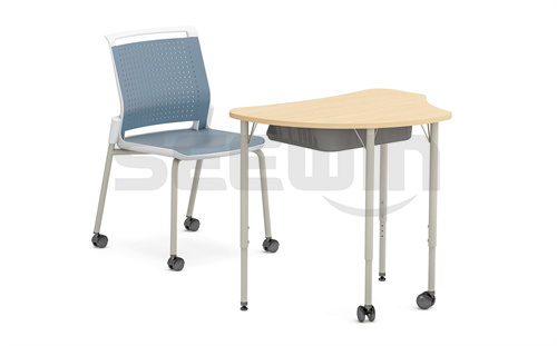 SEEWIN詩敏教學設備愛學系列學生課桌產品精選 E0 級大亞板材,健康環保。優質鋼架焊接,堅固耐用。鋼條焊接書網,承重能力強。桌面板可采用多層板、MFC 板,可選單人位、雙人位,給予學生們最安全的保障與呵護。