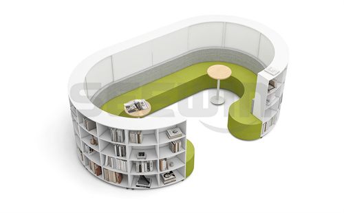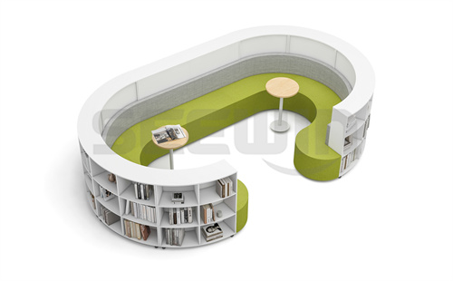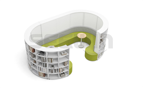 SEEWIN詩敏教學設備海涅系列圖書館書柜弧型造型設計,采用 MFC 環保板材,安全健康,結構牢固穩定,具有超強承重能力。優雅簡約的布藝沙發,采用優質高回彈海綿。坐在沙發上,閱覽國內外文學作品,培養文學素養。